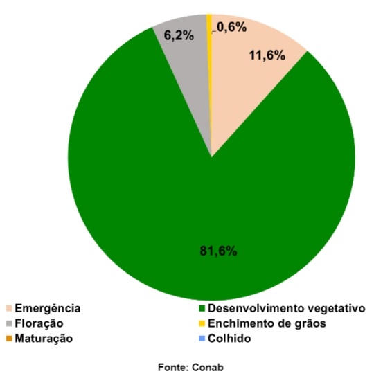 No Paraná, 90% da área foi semeada, com a maioria das lavouras apresentando bom desenvolvimento.
