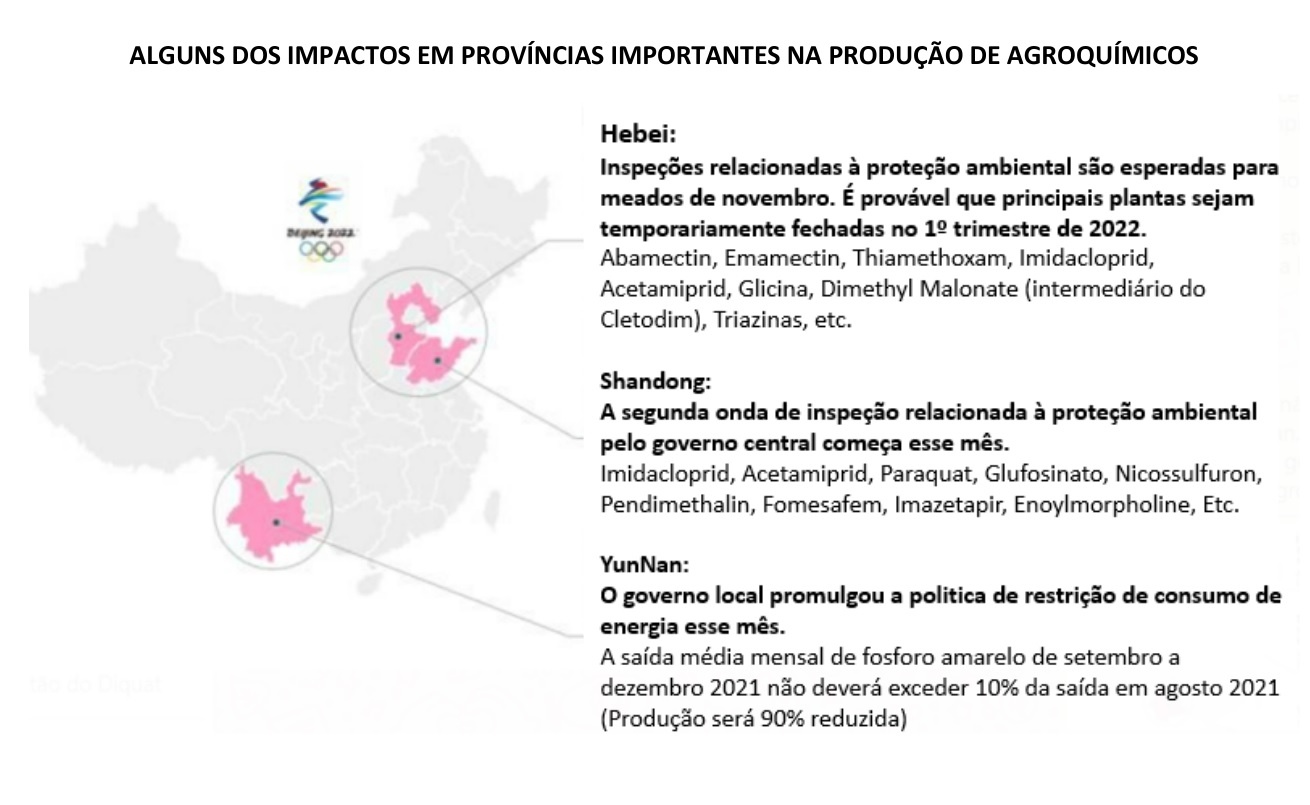 “Temos como maior exemplo a província de YunNan que é a maior produtora de fósforo amarelo na China e que recebeu redução de 90% na disponibilidade de energia. Os preços do fósforo amarelo dobraram entre 1o e 15 de setembro e causaram falta de matéria-prima para produtos importantes como Glifosato, Acefato, Malathion”, aponta a empresa.