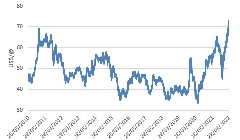 Figura 2. Preços do boi gordo em US$ em 28/03/2022 em comparação com ano anterior.