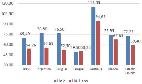 O preço do boi gordo brasileiro, em 28/3, estava cotado em US$69,49/@ ante a cotação de US$54,26/@ registrada há um ano, uma alta de 28%. Valor este ainda competitivo se comparado a seus concorrentes sul-americanos, Argentina e Uruguai, a frente apenas do boi paraguaio.
