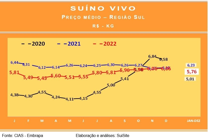 Embora tenham alcançado no último bimestre do ano passado os melhores preços de 2022 na região Sul e bem próximo dos recebidos no mesmo período do ano anterior, no decorrer do ano os suinocultores receberam preços menores que os alcançados em 2021.