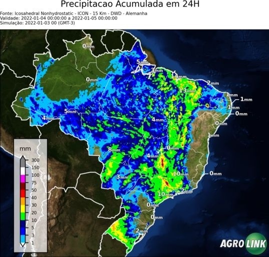 Para os próximos dias, o avanço de uma frente fria - um sistema de chuvas - contribuirá com o alinhamento das instabilidades sobre a faixa central do país, levando chuvas desde SC até a região sudeste, especialmente na quarta-feira (05/01). As instabilidades da frente fria também ajudam a organizar um corredor de umidade que sai da região amazônica passando pelo norte do centro-oeste e parte do nordeste, levando as condições de chuvas para essas áreas. As projeções indicam que os maiores volumes no decorrer da semana, se concentram na grande região de Belo Horizonte, na parcela central de MG, podendo superar os 200 mm. Já em áreas do sul do MA, sul do PI, norte do TO, faixa central do PA e norte do GO também poderão registrar volumes significativos no decorrer dessa semana. Por outro lado, a tendência é de que após a passagem da frente fria, o sul do RS terá novamente um período de tempo seco.