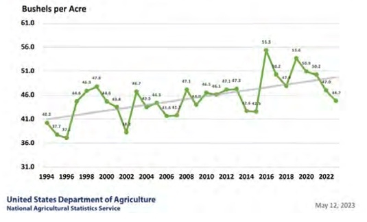 Esse crescimento ocorre apesar de uma redução de 2,3 alqueires por acre no rendimento médio, de 47,0 alqueires por acre no ano passado para 44,7 alqueires por acre previstos no ano atual. No entanto, a tendência de aumento na produção total pode ser atribuída em grande parte à expansão da área colhida, que deve crescer 8%, para 25,3 milhões de acres.