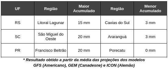 Na região Sul, as chuvas devem ocorrer no inicio da semana, mas com intensidade fraca.
