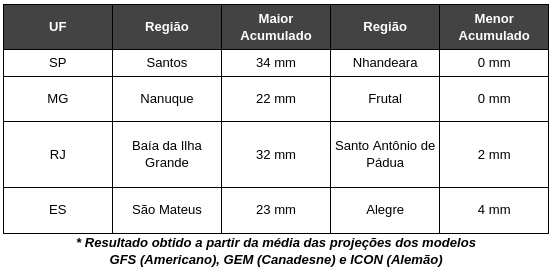Em relação às chuvas, existe uma pequena possibilidade de instabilidades isoladas e passageiras no oeste de Mato Grosso do Sul e oeste de Mato Grosso, em função dos ventos úmidos que atuam na Bolívia e Paraguai, em direção ao sul do continente.