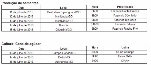 Entre os dias 11 a 15 de julho, profissionais envolvidos diariamente com a produção de sementes, serão capacitados em propriedades nas cidades de Paracatu, Centralina e Tupaciguara, em Minas Gerais, Montividiu e Cristalina, em Goiás e no Distrito Federal. Já os treinamentos em Minas Gerais, voltados à cana-de açúcar, acontecem em propriedades nas cidades de Campo Florido, Delta e Uberlândia, passando pelas Usinas Coruripe, Delta e CMAA, respectivamente.