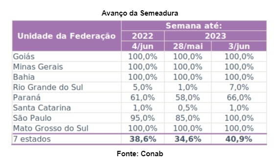 São Paulo, apesar do atraso mencionado anteriormente devido à seca, mostrou um avanço considerável. Na semana passada, a semeadura estava em 85,0%, mas aumentou para 100,0% em 3 de junho, um salto significativo que indica uma recuperação bem-sucedida.