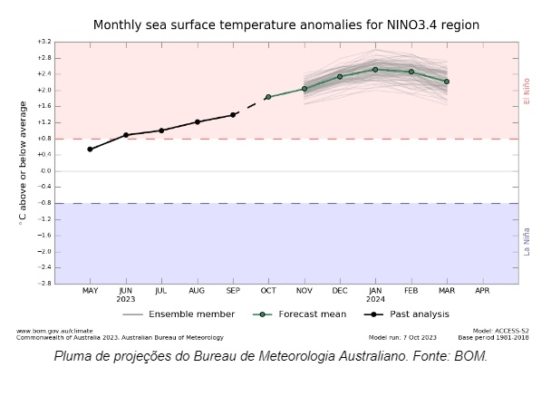 Na mais recente projeção do Bureau de Meteorologia Australiano (BOM) – referência no monitoramento do El Niño – devemos seguir com o fortalecimento do fenômeno nos próximos meses.