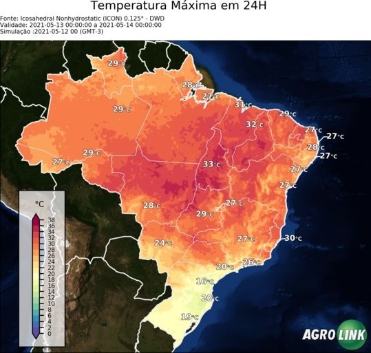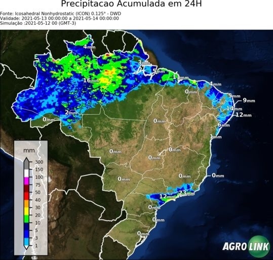 Para esta quinta-feira (13/05), o destaque fica para a manutenção das chuvas na faixa norte e nordeste do país, onde há previsão para acumulados expressivos e localmente fortes. Além disso, a frente fria na região centro-sul, se posiciona de forma oceânica, diminuindo as chuvas ao sul do país e não adentrando no interior. Mantendo assim as chuvas apenas na faixa leste da região sudeste do país. Outro destaque para o dia, ficam para as temperaturas típicas de inverno no centro sul do Brasil.
