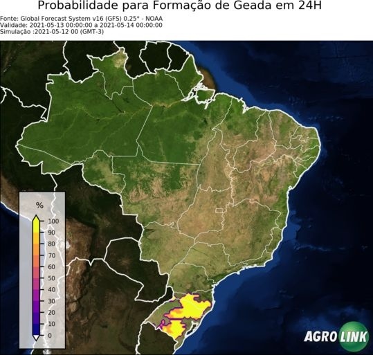 Com o avanço da frente fria sobre a região, a massa de ar polar, frio e seco, mantém as condições para temperaturas típicas de inverno. E com o céu limpo entre a madrugada e amanhecer desta quinta-feira, as condições são favoráveis para a formação de geadas nas regiões serranas, campanha gaúcha, e de forma isolada no oeste de SC. Também há condições para temperaturas negativas nas regiões mais altas dos estados de SC e RS. No estado do PR, ainda há uma maior influência da frente fria, que será expressa na maior cobertura de nuvens sobre o estado, sem condições para chuvas.