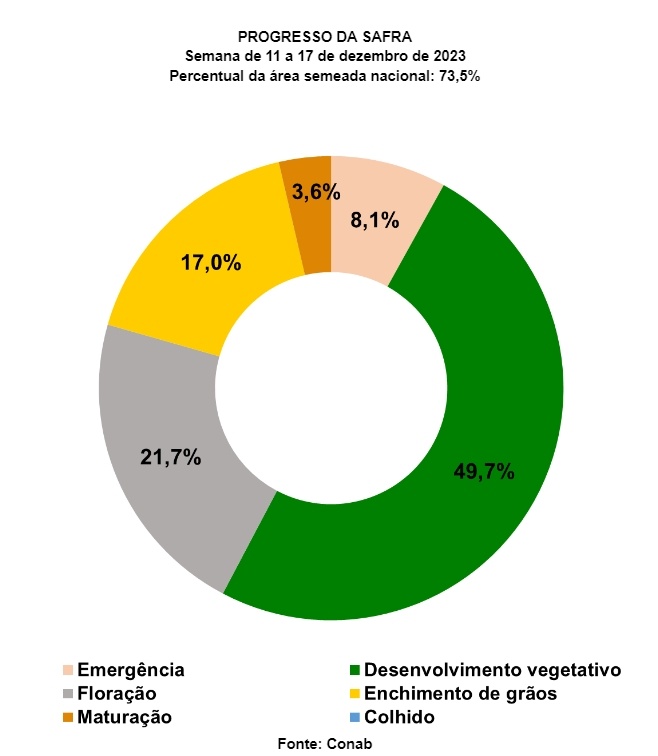 Ainda assim, o progresso geral passou de 65.9% para 73.5% nos estados analisados pela Conab. Comparando com 82.3% do período correspondente na safra anterior, a situação geral pode ser considerada como atrasada..