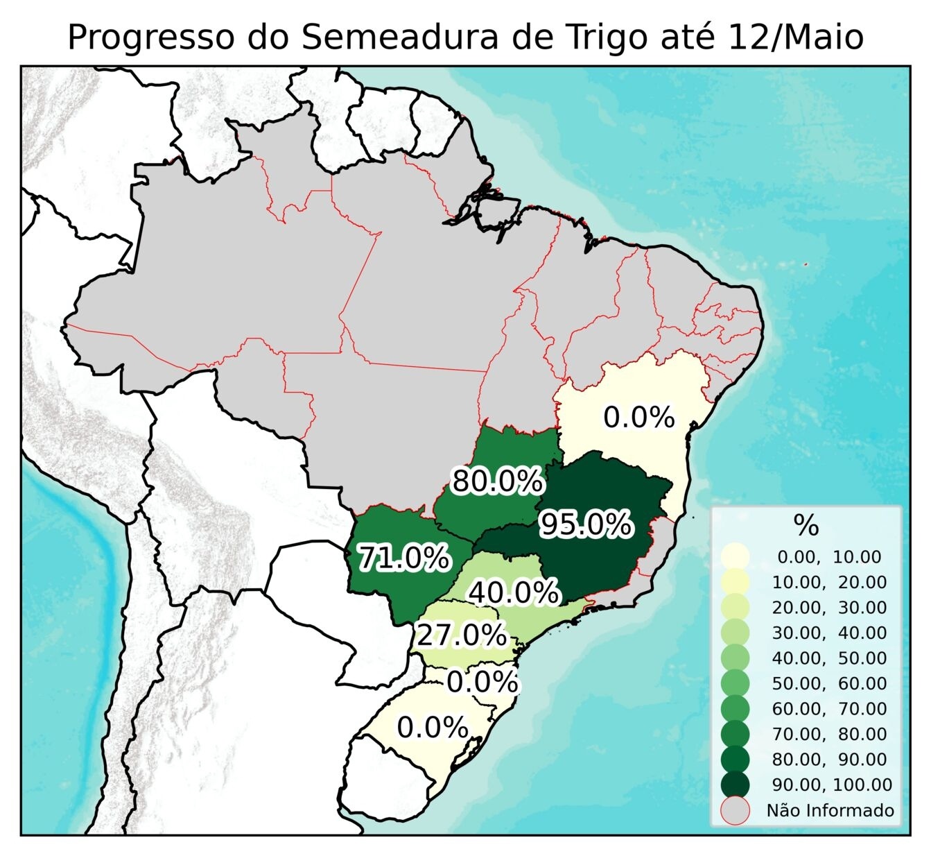 Pelo menos 21% do trigo nacional já foi semeado, de acordo com o levantamento da Conab. Este valor está atrasado (-4,3%), se comparado ao mesmo período do ano passado, onde 25,3% das lavouras já haviam sido semeadas.