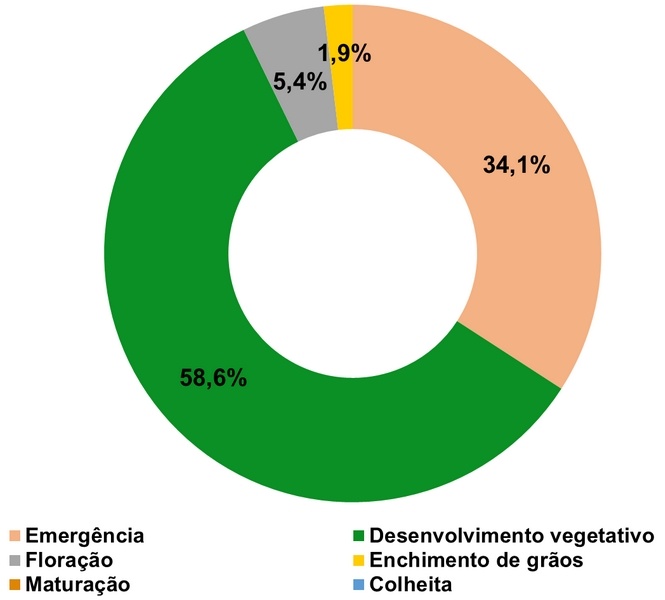 Goiás é o estado mais adiantado em relação aos estádios das lavouras, onde já se encontram as lavouras em enchimento de grãos. Sendo acompanhado por Minas Gerais, com suas lavouras entrando na floração.