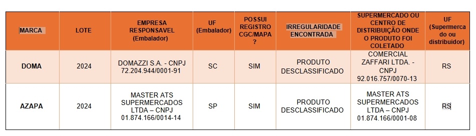 Produtos não atendem aos padrões de identidade e qualidade exigidos