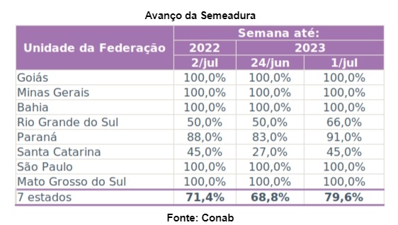 Além disso, nos demais estados produtores - que incluem São Paulo, Minas Gerais, Mato Grosso do Sul, Goiás e Bahia - as operações de plantio já finalizaram na semana anterior. No agregado desses 7 estados, a semeadura atingiu 79,6% na última semana, um avanço considerável em relação aos 71,4% registrados na safra de 2022.