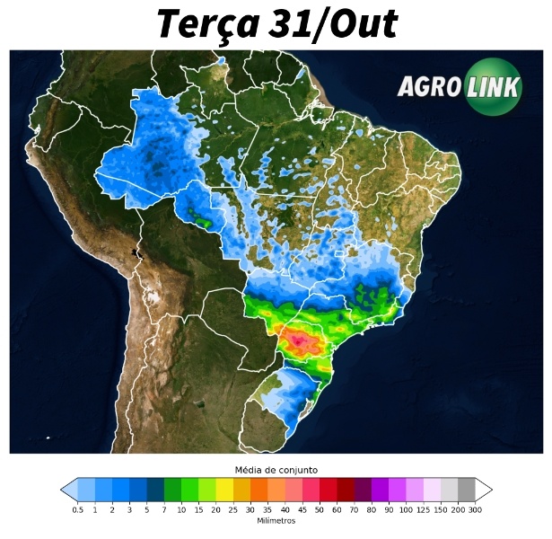 Áreas de baixa pressão persistem sobre a região, garantindo as condições de chuvas. Particularmente sobre o estado do Paraná, onde são previstos volumes superiores aos 60 mm em Pitanga, conforme indicado pela média das projeções. As chuvas também serão expressivas sobre o Vale do Itajaí em Santa Catarina. A expectativa é de uma terça, de tempo fechado, mas com poucas condições de chuva no Sudoeste Gaúcho. As temperaturas devem seguir em marcas amenas, e pouca diferença entre as menores e maiores temperaturas (baixa amplitude térmica) como consequência da grande cobertura de nuvens.
