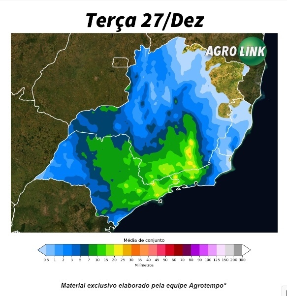 Mas o que as projeções indicam, é uma concentração dos volumes de chuva sobre o sudeste de Minas Gerais. Nas redondezas de Barbacena, os acumulados podem superar a marca dos 30 mm ao longo desta terça-feira (27/12). Nas proximidades de Campos do Jordão (SP) e Vassouras (RJ) o prognóstico também sinaliza para chuvas de 30 mm.
