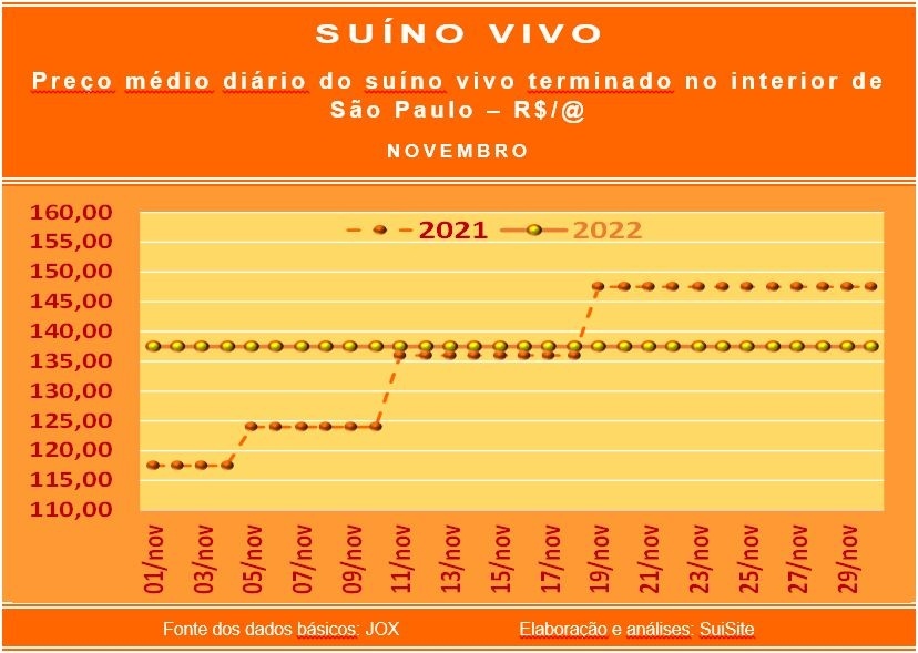 Suíno vivo: desempenho do preço médio diário no decorrer de novembro de 2022