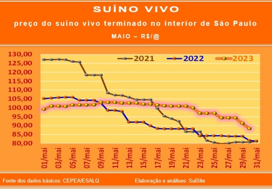 O resultado foi um preço médio diário de R$88,35 por arroba de cevado comercializado em São Paulo, significando queda de 10,9% em relação ao mesmo período do mês passado, enquanto ainda apresentou incremento de 8,3% sobre o mesmo período de 2022.
