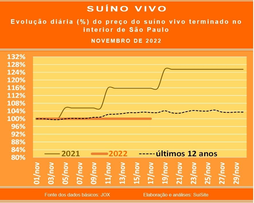 O mercado de carne suína segue sem apresentar maior movimentação no comércio varejista. Mesmo assim, os suinocultores seguem sustentando preço nos fechamentos realizados com o suíno vivo. O resultado, nesse momento, é um preço médio diário que segue inalterado no decorrer de novembro, seguindo abaixo da evolução média alcançada no ano passado e no histórico dos últimos 12 anos. Houvesse acompanhado a média histórica, o preço atual seria de R$142,00, enquanto pela evolução do ano passado teria alcançado R$159,00.