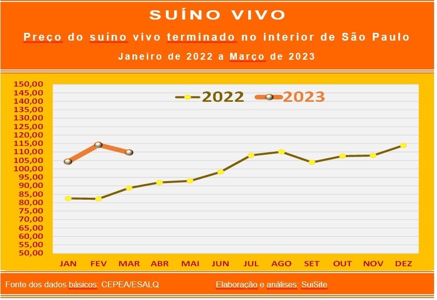 O preço médio de março atingiu R$109,66 por arroba, significando queda de 4% sobre o mês anterior, enquanto indicou aumento expressivo de 23,7% sobre o recebido em março do ano passado, quando os preços iniciavam trajetória de alta. No trimestre o preço médio atingiu R$109,37, equivalendo a incremento significativo de 29,4% sobre o mesmo período de 2022.