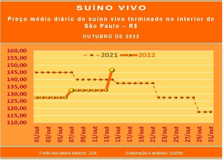 As disponibilidades ajustadas de cevado e a disposição dos suinocultores em disputar melhores condições de comercialização resultou em forte aumento no último dia de negócios da semana passada. O novo reajuste – 1º da semana, 2º do mês, 19º do ano – elevou o preço médio do suíno vivo para R$146,50, equivalendo a incremento significativo de 14,9% sobre o praticado na abertura do mês e de 4,6% em relação ao mesmo dia do ano passado. O acumulado em outubro e no decorrer do ano, por sua vez, apontam quedas de, respectivamente, 7,8% e 7,1% sobre os mesmos períodos de 2021.