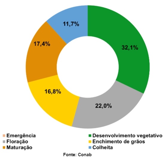 Por último, na Bahia, as lavouras estão majoritariamente em fase de enchimento de grãos e maturação, e a colheita já atingiu 20% da área total.