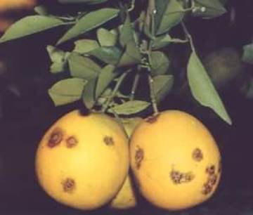 Nos frutos, os sintomas se caracterizam por uma mancha deprimida de cor marrom, circundada por um halo amarelado, enquanto o fruto estiver verde. Estes sintomas se manifestam 2 semanas após o ataque do ácaro, sendo que os frutos caem logo após o aparecimento do sintoma.