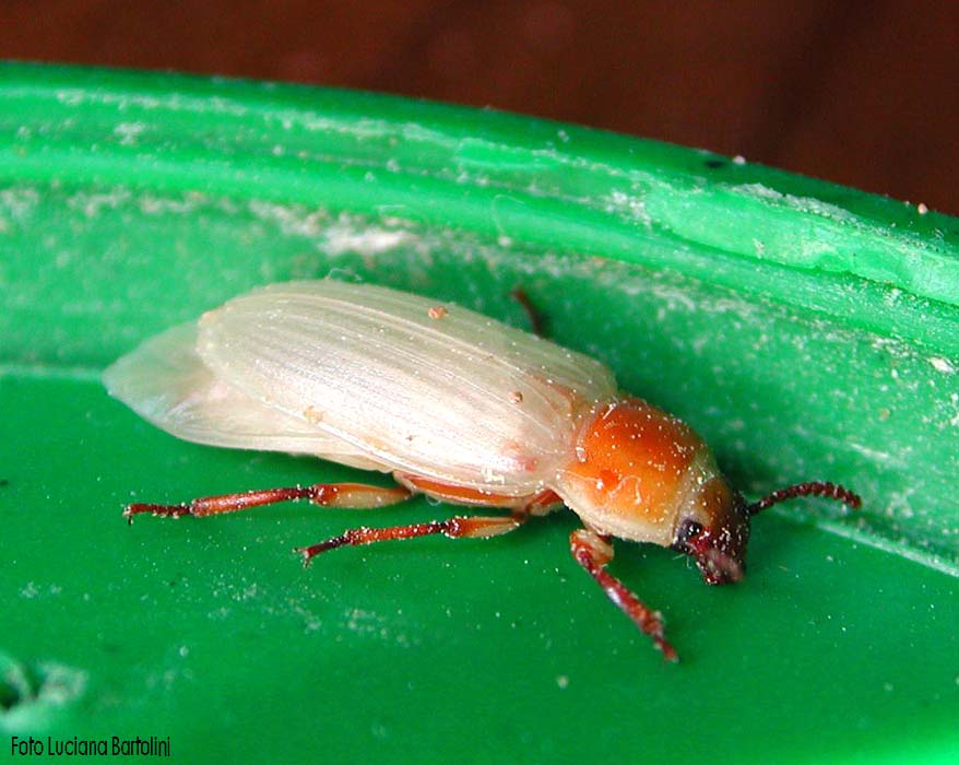 Danos: As larvas destroem farinhas, fubás, farelos, rações, macarrão, grãos quebrados ou anteriormente danificados.