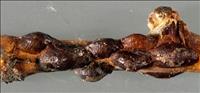 A cochonilha possui forma arredondada ocorrendo em colônias de cor marrom localizadas nas brotações do ano. Causam redução no crescimento dos ramos. Normalmente encontram-se associadas a formigas que as protegem dos inimigos naturais e auxiliam na dispersão.