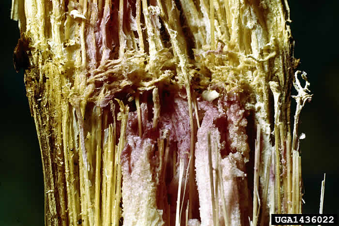 Danos: Os sintomas internos caracterizam-se por uma alteração na cor da medula, que pode variar de esbranquiçada a marrom. Em estádios mais avançados da doença, pode ocorrer a quebra do colmo. O patógeno afeta os internódios inferiores, podendo atingir também os internódios superiores. Atingem também as raízes.