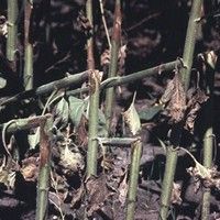 Sintomas - Os primeiros sintomas da doença ocorrem nas folhas medianas ou baixeiras, normalmente após o florescimento. Cerca de 10 a 15 dias após a infecção, pequenas manchas necróticas, circundadas por um halo amarelado, aparecem na margem das folhas e evoluem em direção à nervura principal da folha. As folhas infectadas rapidamente murcham e morrem.
