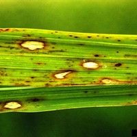 Danos: Os sintomas de infecção por Alternaria padwickii nas folhas são manchas ovaladas de 3 a 10 mm de diâmetro, inicialmente amareladas, tornando-se cinza claro, com bordos escuros.