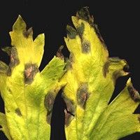 Danos: O sintoma típico da doença são manchas cloróticas em ambas as faces das folhas, com textura de papel. As lesões ocorrem em ambas as faces da folha e aparecem como pequenas manchas cloróticas, circulares, secas, com textura de papel, que aumentam rapidamente de tamanho até 1-2 cm de diâmetro, tornam-se cinza-amarronzadas e não têm um bordo limitante. Nos pecíolos, as manchas são alongadas e paralelas ao eixo longitudinal destes. As folhas, com várias manchas, tornam-se cloróticas e murchas. Sob condições favoráveis ao desenvolvimento da doença, forma-se grande quantidade de conídios no interior das lesões, e as plantas murcham completamente.