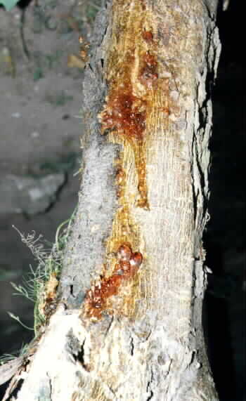 Danos: Os primeiros sintomas ocorrem na região do colo da planta, quando há o aparecimento de manchas de coloração parda e aspecto úmido, evoluindo para o apodrecimento da casca, formando cancros com exudação de goma. A casca afetada desprende-se expondo o lenho já infectado que também apresenta coloração parda. O cancro fica delimitado temporariamente por um calo, formado pelo cambio como estrutura de defesa. Com a evolução da doença, as lesões expandem-se, anelando o tronco, atingindo os feixes vasculares, causando, com isso, reflexos diretos na copa. Como conseqüência da lesão nos feixes vasculares ocorre clorose, murcha, amarelecimento e seca das folhas, abortamento das flores e queda das frutificações fora da época. P. nicotianae var. parasitica causa seca e morte da planta, sendo responsável também por grande percentagem de morte em pomares formados com mudas oriundas de viveiros contaminados.