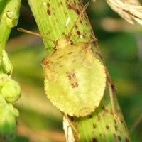 Percevejos com 11 mm de comprimento, de coloração marrom uniforme e abdome verde.