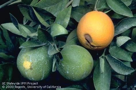 Danos: Frutos com podridão negra amarelecem prematuramente e podem apresentar uma mancha de cor parda na casca, que quase sempre aparece na extremidade estilar do fruto. Entretanto, a doença pode se manifestar somente na parte interna do fruto, na forma de uma podridão negra, que se inicia numa de suas extremidades, principalmente na estilar, e que avança até atingir toda a columela central e os tecidos a ela adjacentes. Quando a doença ocorre em campo, provoca uma intensa queda prematura de frutos maduros ou em vias de maturação.