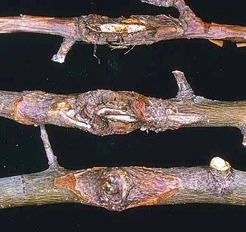 Controle - As estratégias de controle recomendadas para esta doença incluem a redução de inóculo com a eliminação dos cancros, visto que neles se desenvolvem as estruturas do patógeno e a remoção dos ramos de poda, dos frutos do raleio e de poda de inverno e verão. No controle químico se recomenda o uso de fungicidas cúpricos no inverno e de benzimidazois e protetores em pré-colheita.