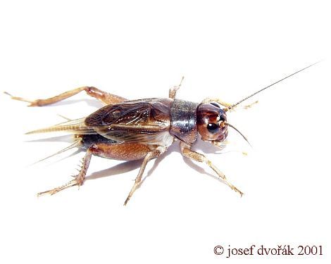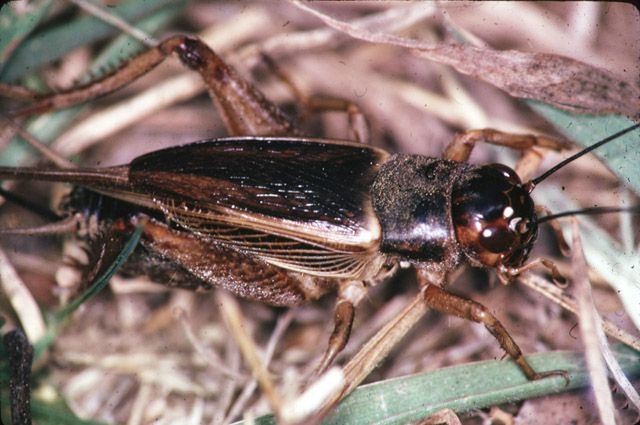 O adulto possui coloração escura e mede aproximadamente 25 mm de comprimento. Possui as pernas anteirores do tipo ambulatórias e as posteriores saltatórias.