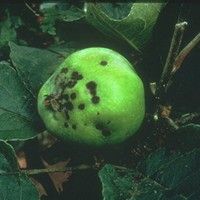 Nos frutos, inicialmente aparecem pequenas lesões circulares nos frutos e posteriormente ocorrem deformação, rachaduras e queda prematura.