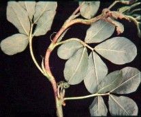 Sintomas - Os sintomas manifestam-se em toda a parte aérea das plantas na forma de cancros ou verrugose. Nos folíolos, as lesões são pequenas, arredondadas ou irregulares, isoladas ou confluentes, com centro deprimido e margens salientes. Na superfície superior do limbo foliar, sua parte central, de tonalidade clara, é circundada por uma margem escura, enquanto que na superfície inferior é rosada a pardo-clara, com margem pardo-escura. Tais lesões se encontram localizadas mais freqüentemente junto às nervuras.