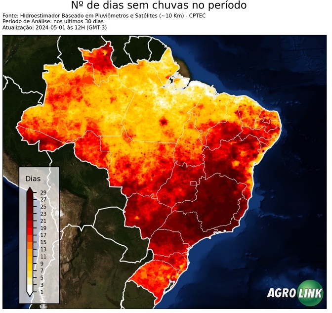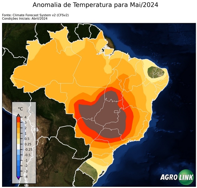 As projeções para o m?s de maio indicam um cenário alinhado com os meses anteriores, as temperaturas devem ser significativamente mais quentes do que a média histórica em áreas do Brasil central, como noroeste Paulista, Triângulo e Oeste Mineiro, nordeste de Mato Grosso do Sul, metade sudeste de Mato Grosso, todo o estado de Goiás e áreas do sul de Tocantins. Nestes setores as temperaturas devem ficar até 3°C acima da média para o período.