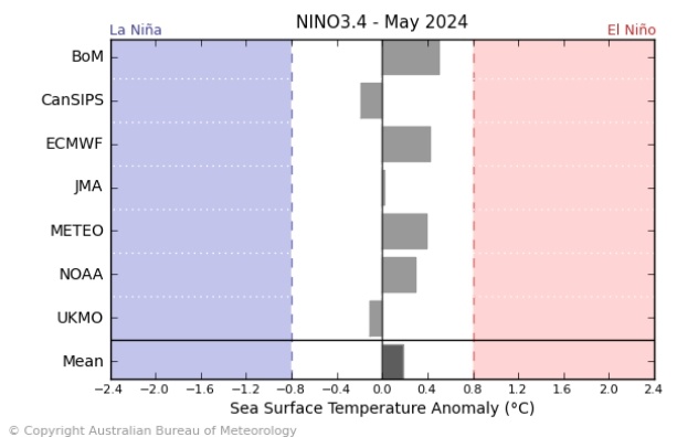 Comparação entre as projeções para a anomalia da temperatura da superfície do mar na região do Nino3.4 no mês de maio. De acordo com o centro australiano, valores entre ±0.8°C em relação à média histórica, é considerado como Neutralidade do fenômeno El Niño. Fonte: BOM.