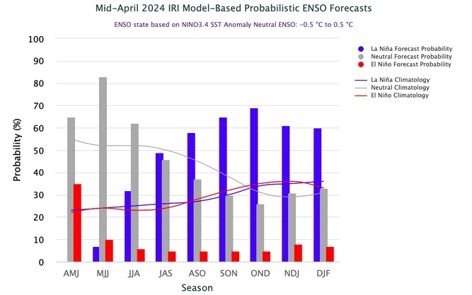 Já as projeções do Instituto Internacional para o Clima e Sociedade da universidade de Columbia nos EUA (IRI/Columbia), indica que o semestre entre Abril e Junho a classe mais provável para as condições oceânica é de Neutralidade (64%)