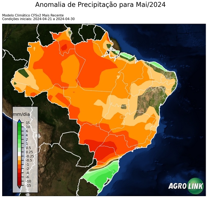 Previsão para a variação das chuvas em relação à média no mês de maio. Áreas em laranja indicam previsão de chuvas abaixo, e áreas em verde indicam chuvas acima da média histórica.