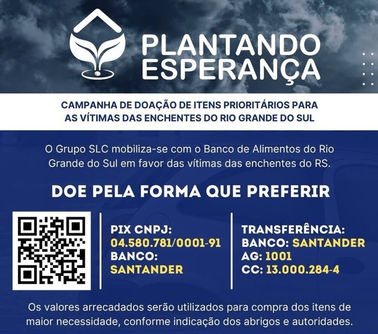 O Grupo SLC une forças com o Banco de Alimentos do Rio Grande do Sul em uma ação solidária em prol das vítimas das enchentes que assolam o estado. Com a devastação causada pelas águas, milhares de famílias enfrentam dificuldades e precisam de apoio urgente para reconstruir suas vidas.