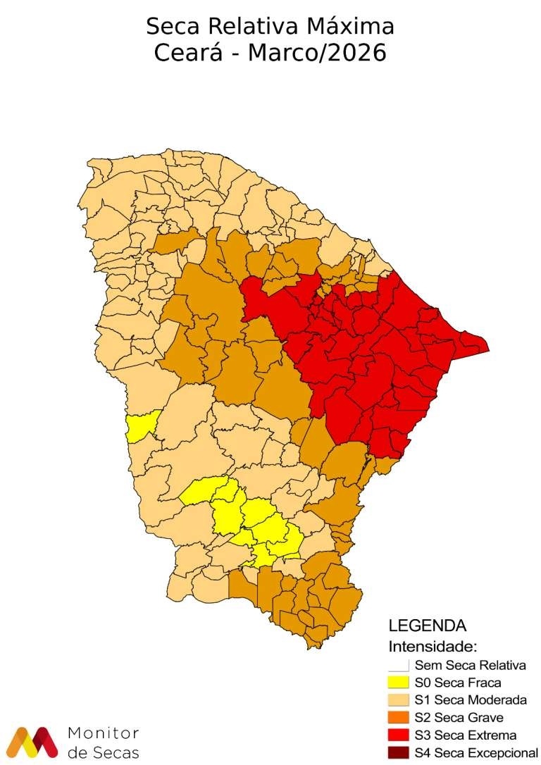 Segundo o governo do estado do Ceará, o mais recente mapa do Monitor de Secas, na categoria de Seca Relativa Máxima (SRM), indica que o cenário de maior severidade da estiagem no estado manteve-se praticamente estável entre fevereiro e março. A seca extrema segue atingindo 13,79% do território, com maior concentração na porção leste, especialmente na região Jaguaribana e em municípios do litoral, como Aracati.
