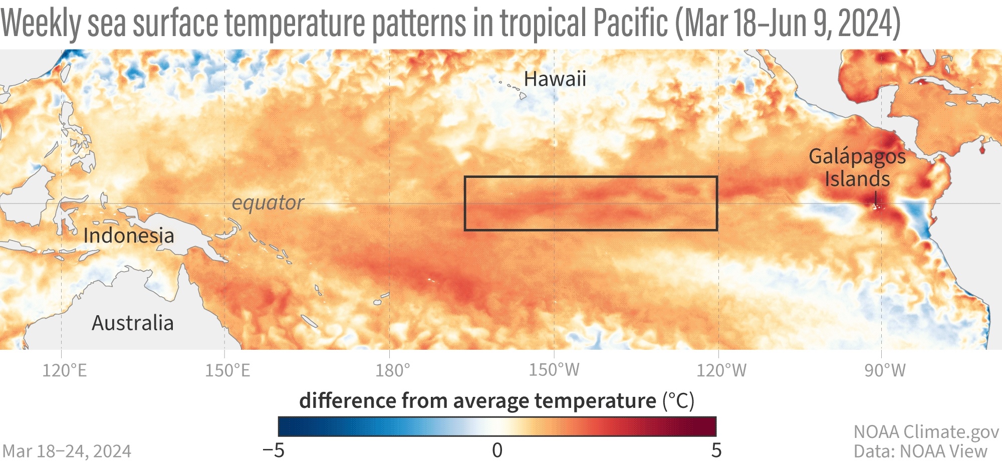 Anomalias de temperatura na superfície do mar na região de monitoramento do El Niño - Oscilação Sul. Áreas em azul, indicam temperaturas abaixo da média. Áreas em vermelho indicam temperaturas acima da média. Fonte: NOAA.