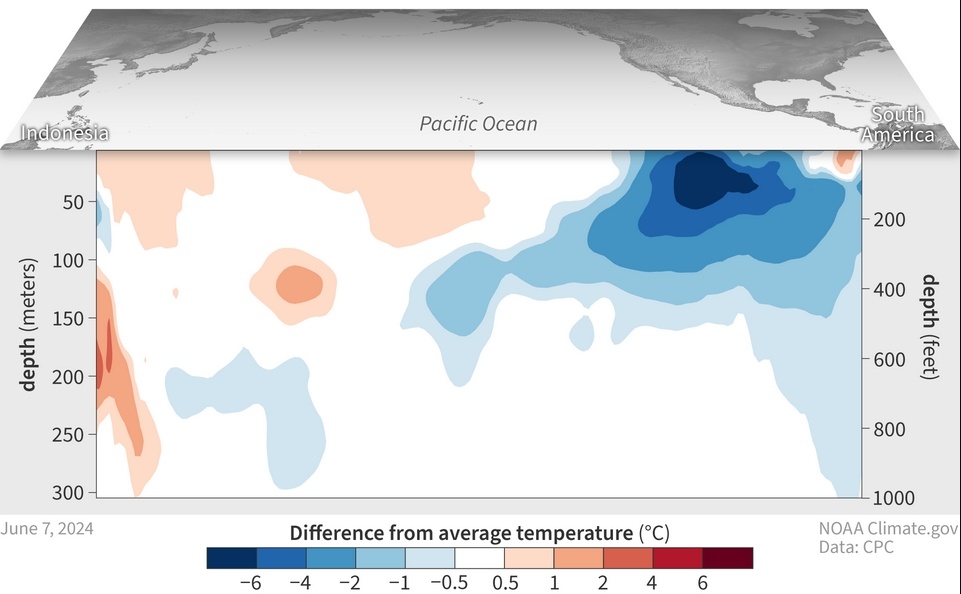 Bolsão de águas mais frias do que o normal surgindo abaixo da superfície do mar em áreas da costa do Peru. Ao mesmo tempo, as anomalias quentes são suprimidas em toda a região de monitoramento. Fonte: NOAA