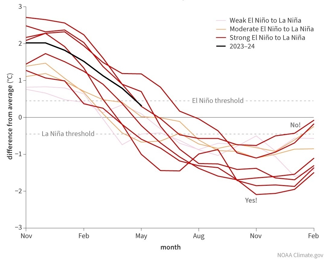 No entanto, avaliando os eventos passados, as vezes que o Pacífico tropical passou de El Niño para La Niña dentro de um mesmo ano, não fica claro a relação entre a intensidade dos eventos.